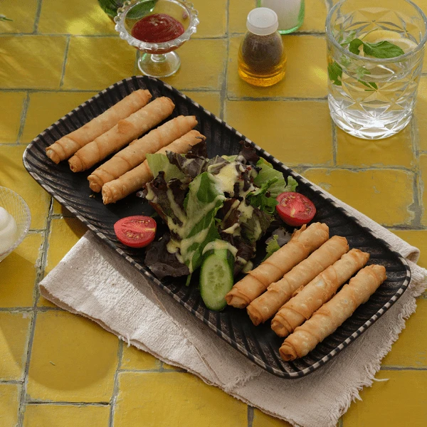 Sekiz adet sigara böreği ve ballı hardal soslu mevsim yeşillikleri ile